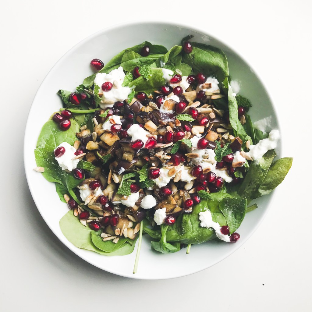 Add the aubergine (cold), the pomgrande and silken tofu or feta cheese.