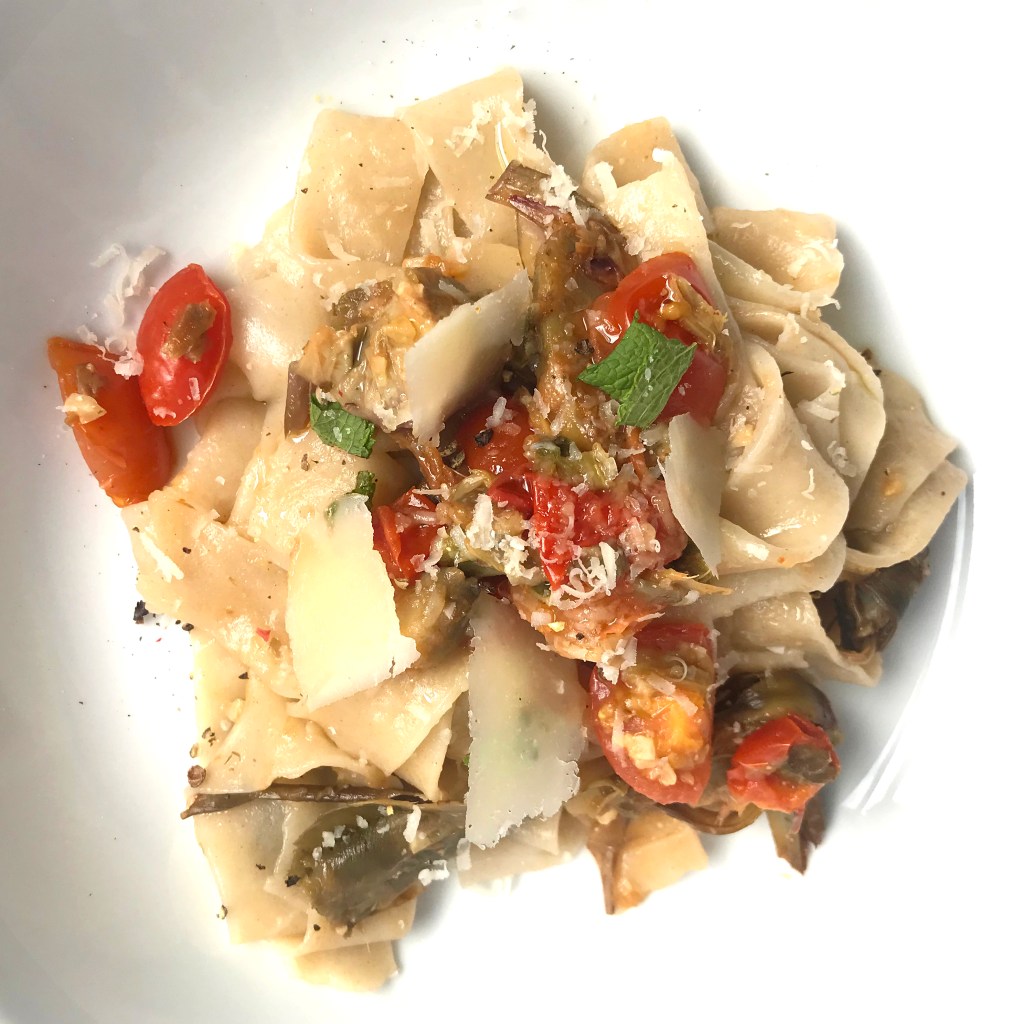 Lay the flour on a board in a vulcano shape. Create a hole in the centre and fill it with few pinches of salt and half of the water.