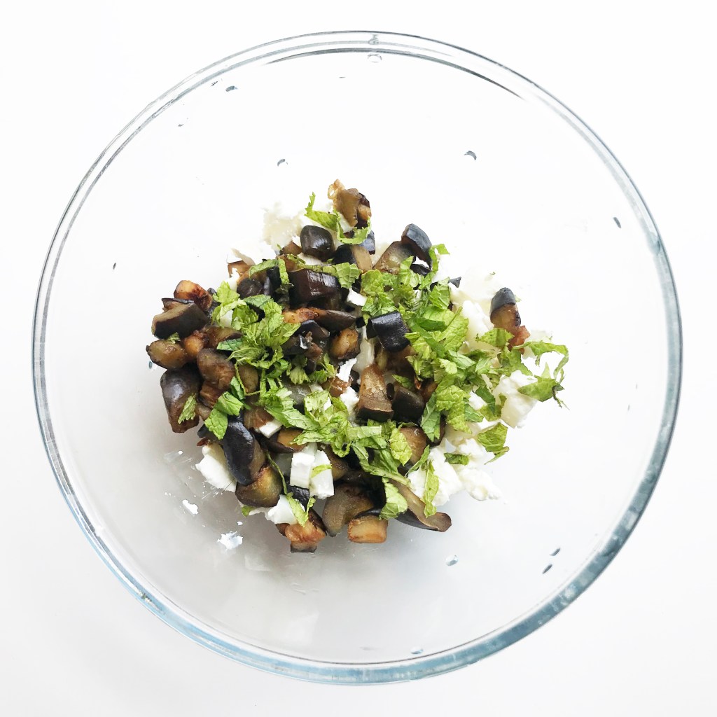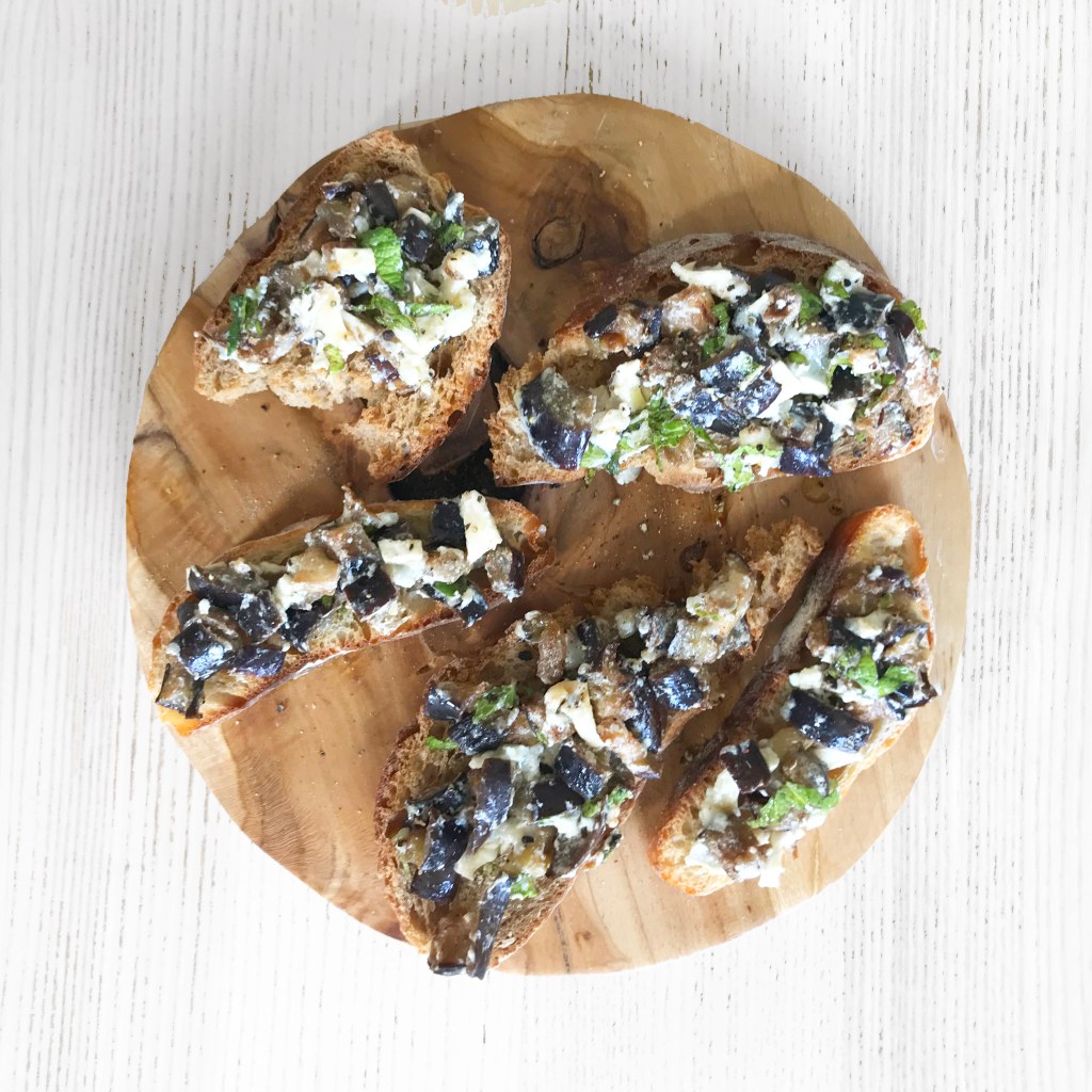 Spread the bread slices with a generous layer of aubergine mix on top, then sprinkle over few min leafes, pomegranate seeds (if using) and few drops of olive oil.