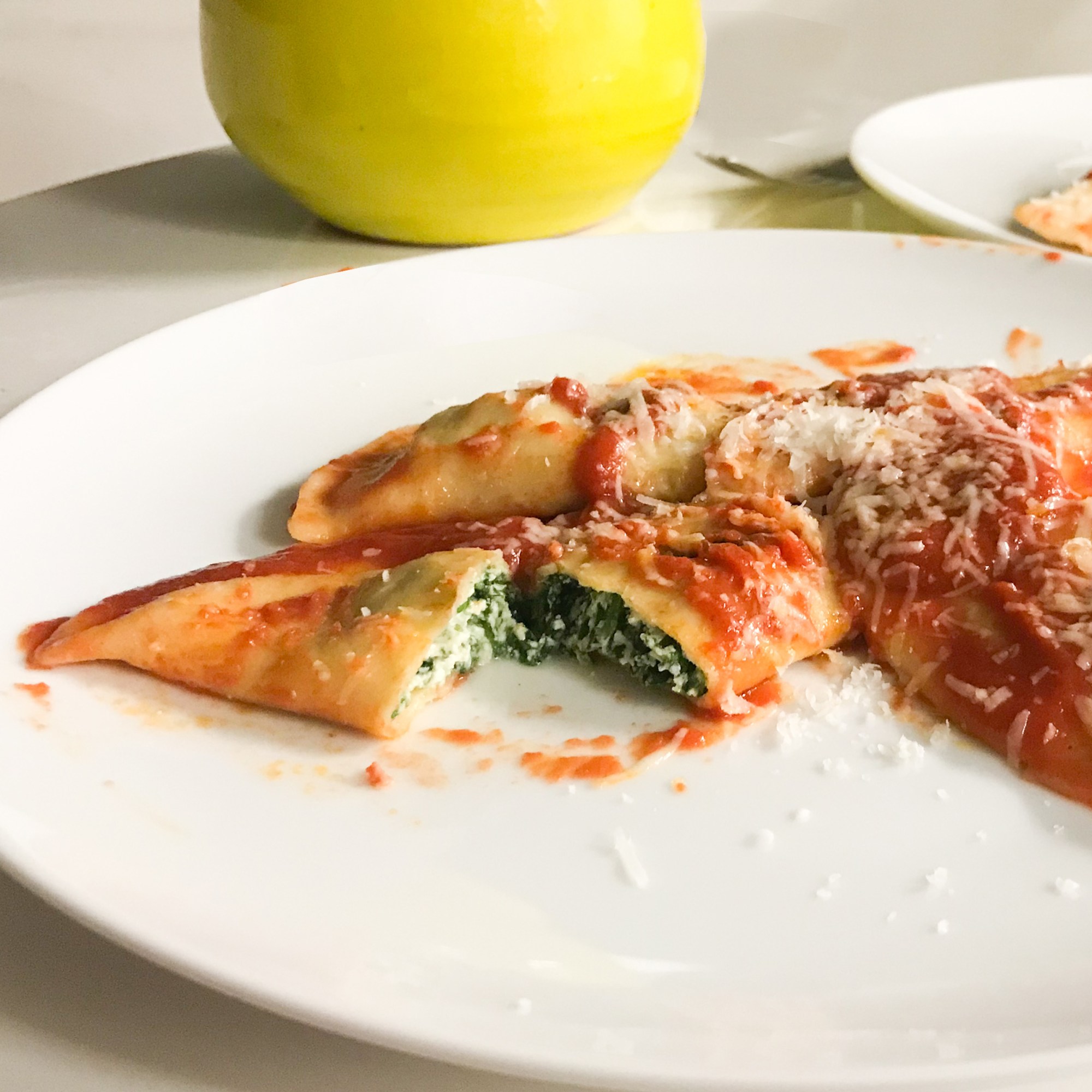 Combine 4/5 ravioli on a plate, add some extra tomatoe sauce on the top, sprinkle with parmesan and garnish with the basil leaves and few drops of olive oil.