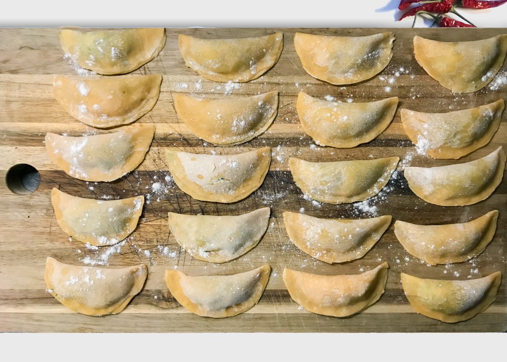 It is very important to put some drops of water on the sides of each raviolo to stick the two sides of dough together, otherwise it will fall apart while boiling it.