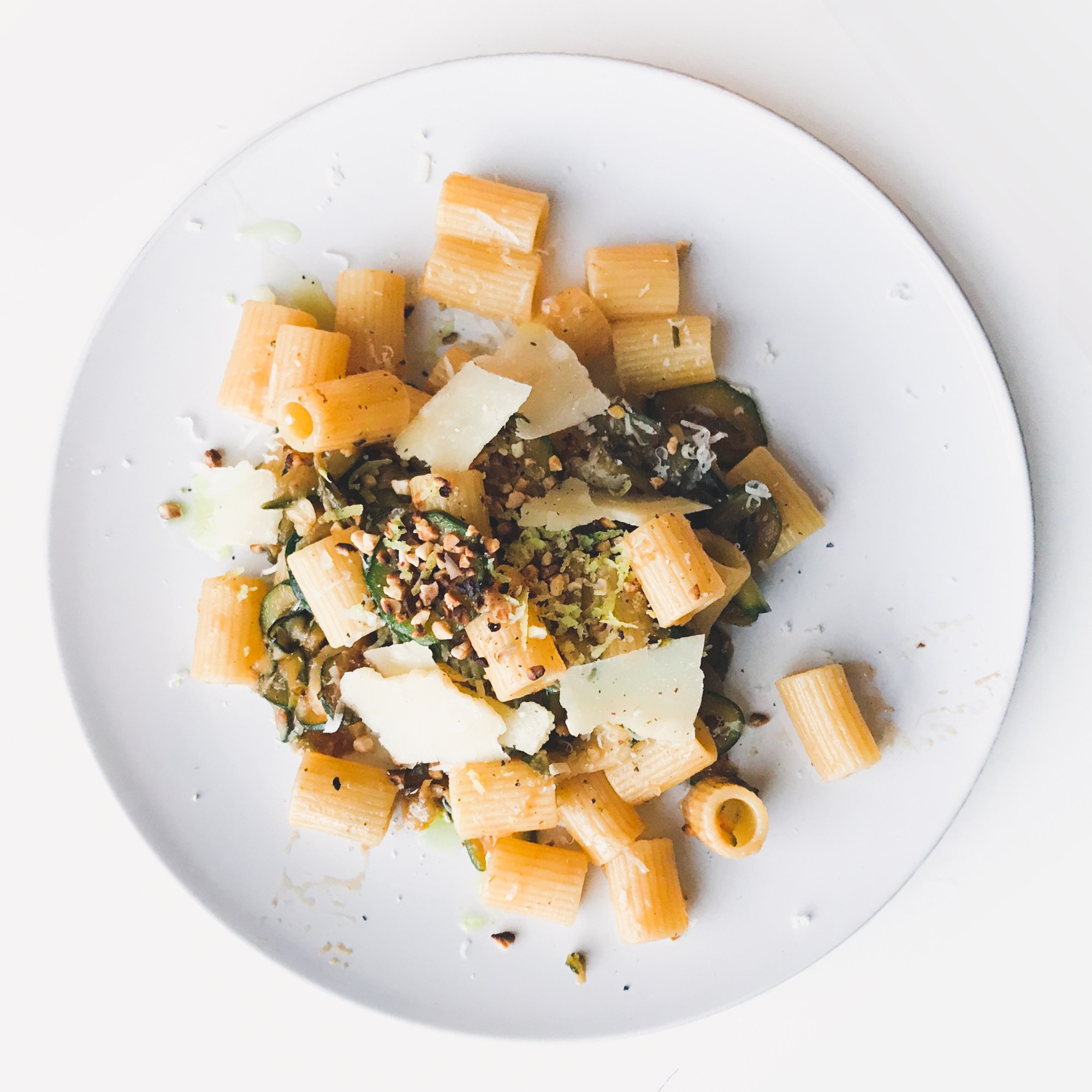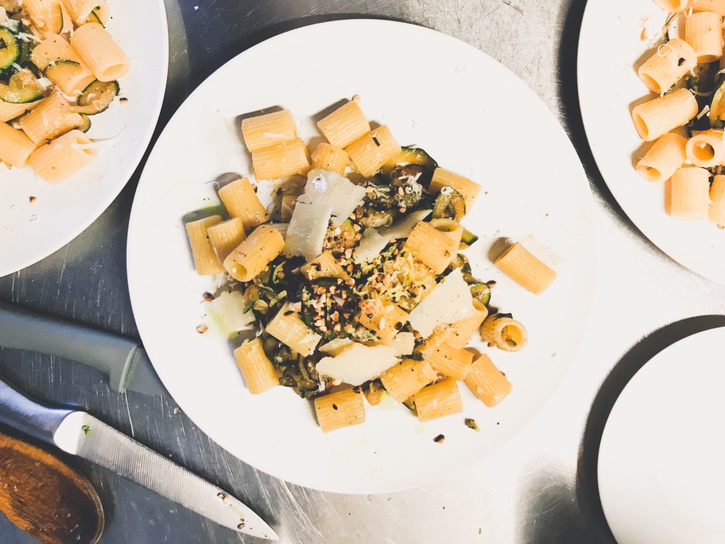 Drain mezzemaniche and add the pasta in the pan along with the courgettes cream and stir on heat for 2min.