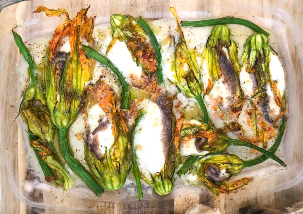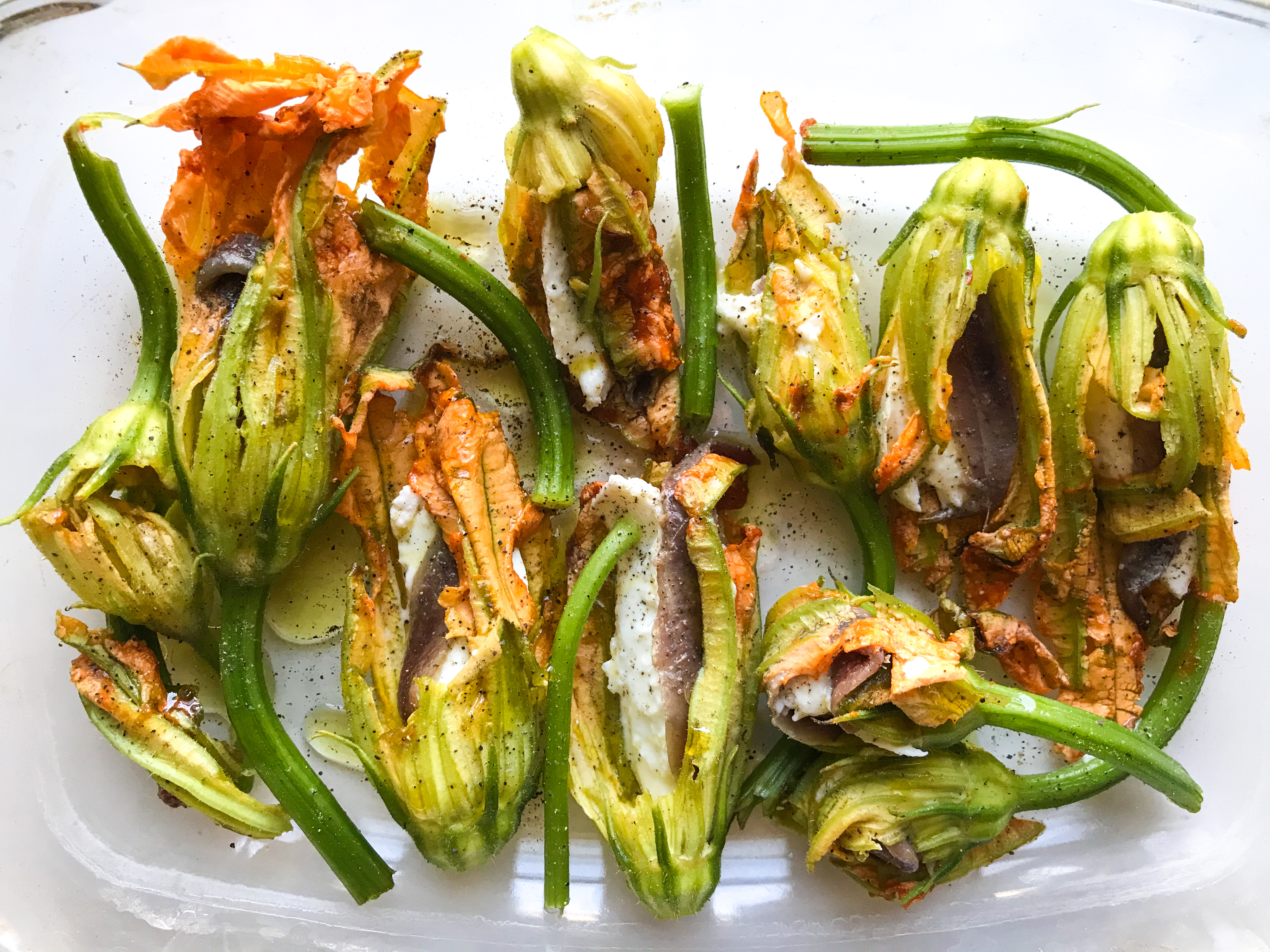 Place the filled squash blossoms on an oven tray and sprinkle with salt& pepper and extravirgin olive oil.