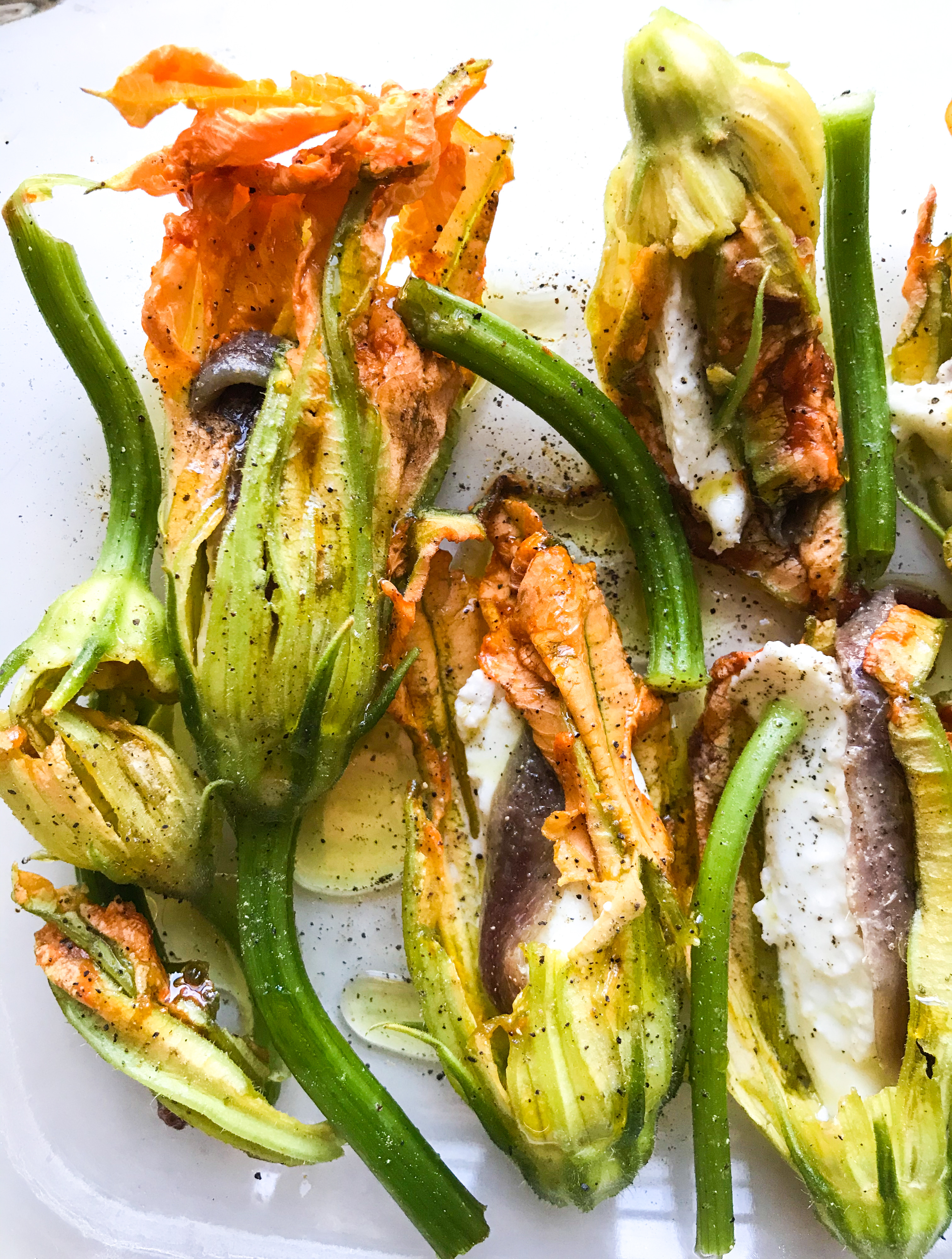 Gently fill the blossoms with and anchovie and a longitudinal slice of mozzarella (if buffalo mozzarela, even better) and gently twist the petals together to seal.