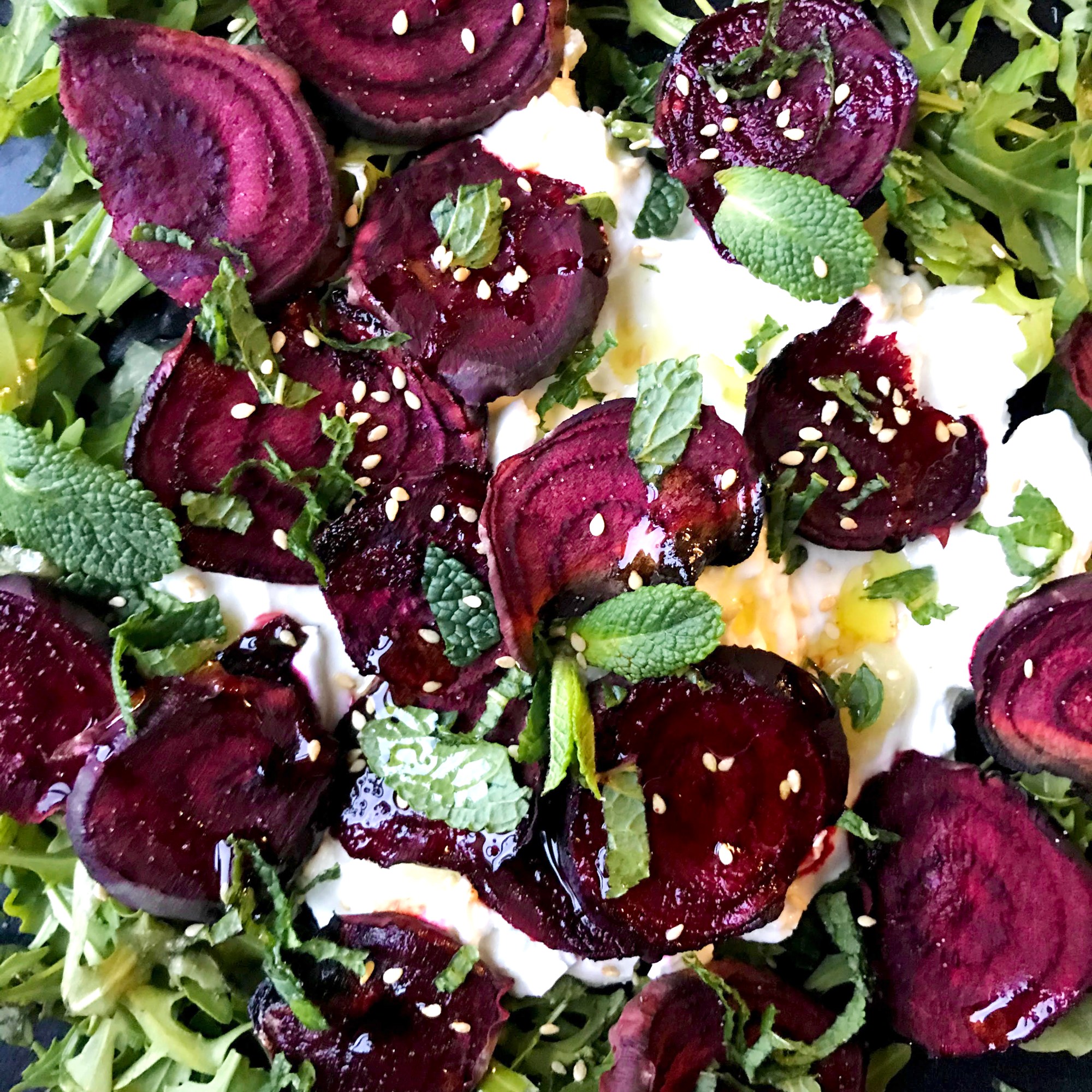 Once the beets are done, arrange them on top of the yogurt cream, spooning the sesame seeds over. Finish with remaining lime juice and mint leaves and serve at once.