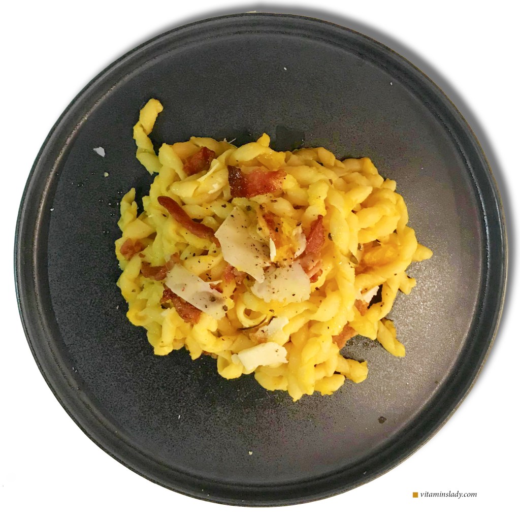 Add drained pasta to the sauce, add the crispy bacon and grated parmiggiano.