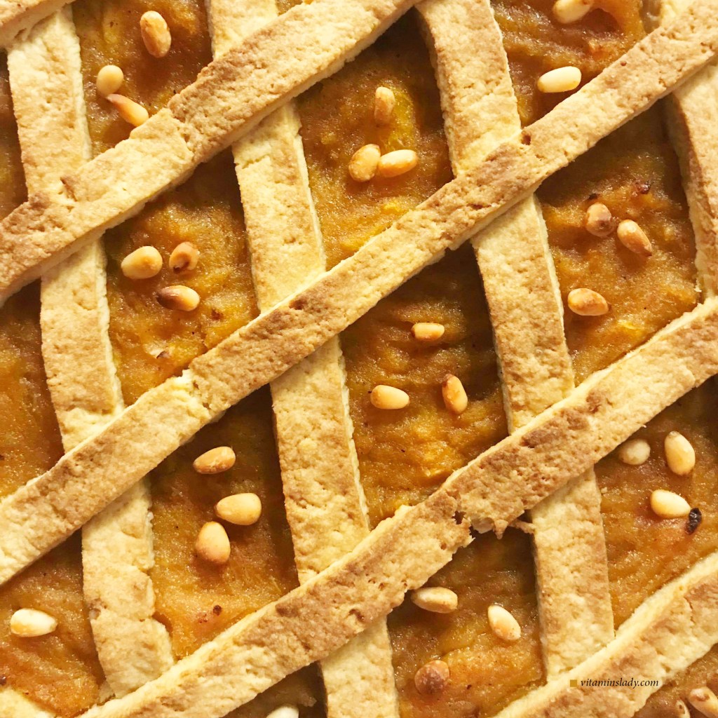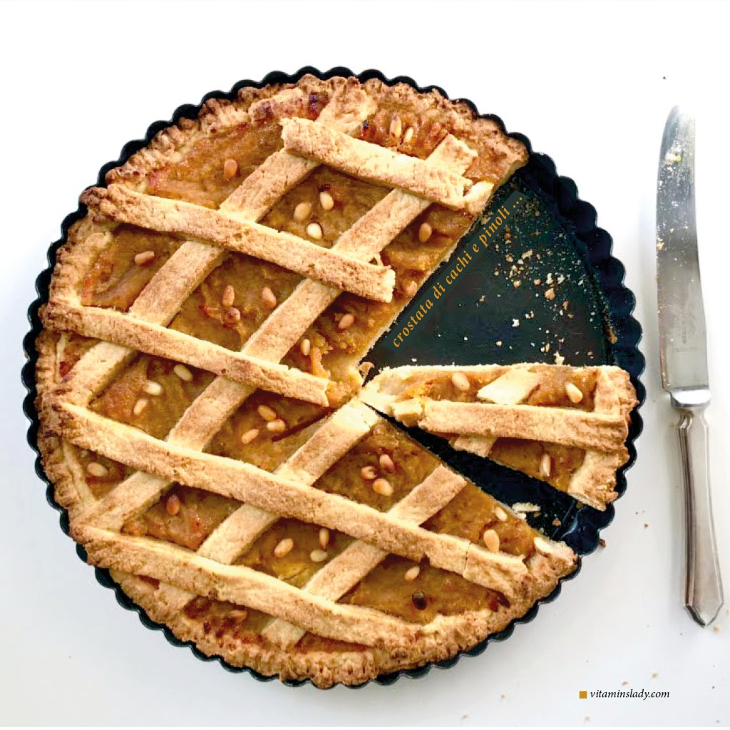 Fill the pie with the persimmon jam along with the pine nuts and criss-cross your lattice strips over the top.