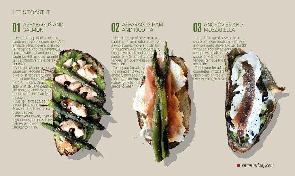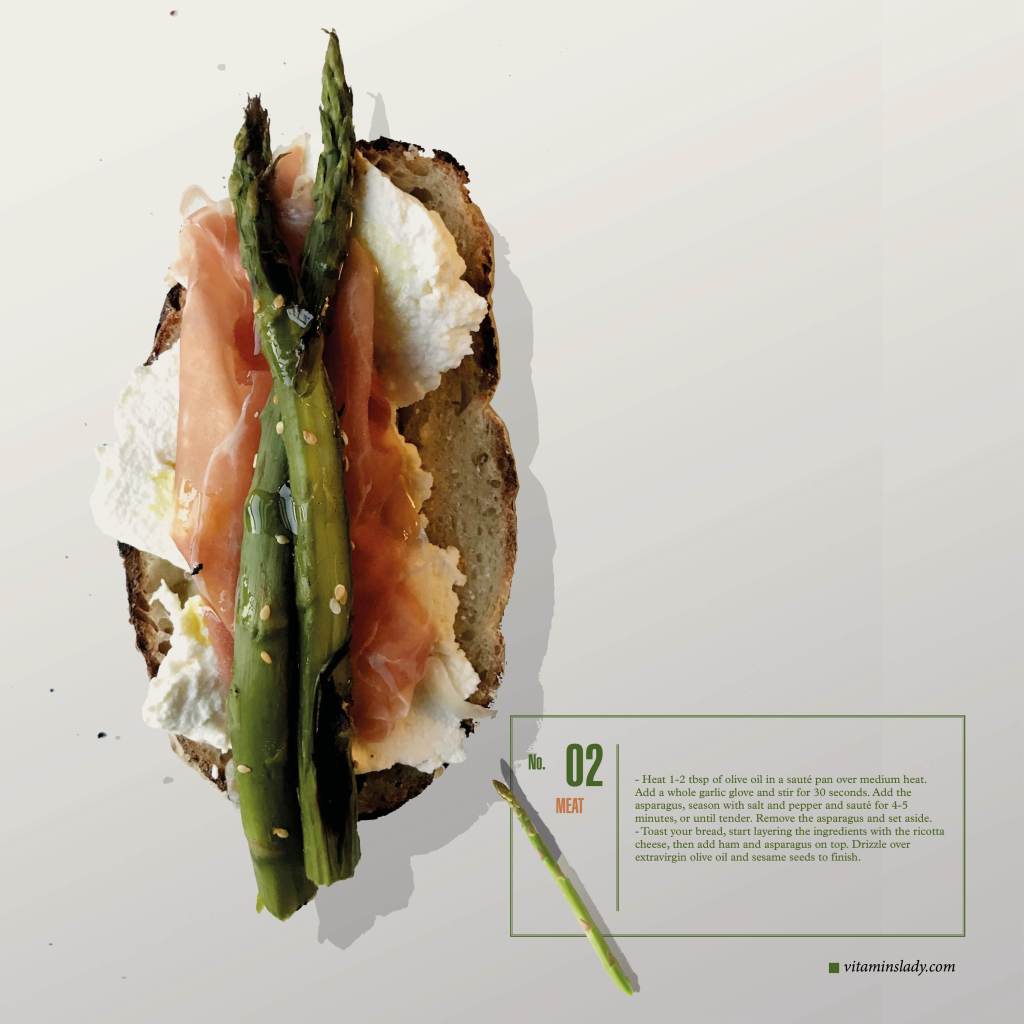 Toast your bread, start layering the ingredients with the ricotta cheese, then add ham and asparagus on top. Drizzle over extravirgin olive oil and sesame seeds to finish.